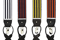 Sophisticated and timeless, these braces convey class and style. We carry these handsome braces in two traditional stripe patterns. Choose from 4 color combinations of equal stripes, or 4 color combinations of variable width stripes. And with their convertible attachments you can opt to wear them as clip-on or button-on attachments - like getting two suspenders for the price of one!