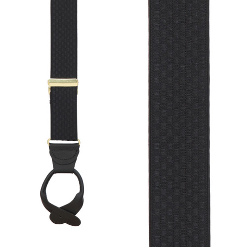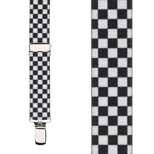 Shop our contemporary looks in checkered print suspenders in black and white or an array of color combinations at the SuspenderStore. Our checkerboard shirt suspenders are available in six sizes to fit kids and grownups. The all-elastic construction is accented with nickel or brass finish hardware and clip attachments. Our black-on-black checkered suspenders in a jacquard weave are also available in burgundy-on-burgundy and neutral camel-on-camel styles. These elastic suspenders have X-back styling with a distinctive metal cross piece and brass hardware. X-back suspenders have two pants clips in front and two in back. Consider the bold look of our black and white racing checks suspenders available in 42-inch, 48-inch and 54-inch lengths. These suspenders with dressy finger clips are 1.5 inches wide to dress up button-down office shirts or more casual wear at the racetrack. Our Grand Prix Limited Edition checkered suspenders are crafted of 100 percent premium silk. Instead of an all-over checkerboard pattern, these limited edition braces have a checkered flags pattern on white. They are hand woven on wooden looms in France for an elegant look that you won't find at other men's accessories stores. Elastic discreetly sewn below the Y-back on these silk shirt suspenders allows more comfort and a better fit. The width is 1 3/8 inches. Checks are for kids, too. We carry black and white checker suspenders in a 1-inch width in sizes that will fit toddlers and children up to 5 feet tall. You can also buy our popular racing checks clip suspenders in a 36-inch length for children. Pair these suspenders with our pre-tied bow ties in black and white or contrasting colors. We've been selling the world's finest suspenders since 1999. You can trust our expertise. Rely on our outstanding customer service.