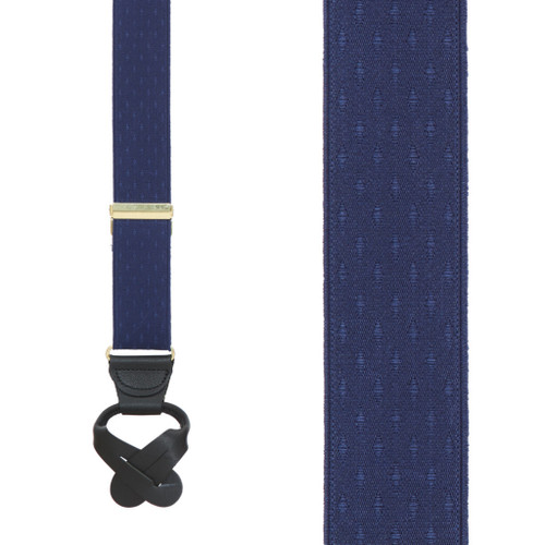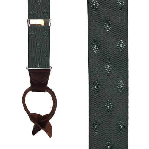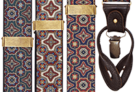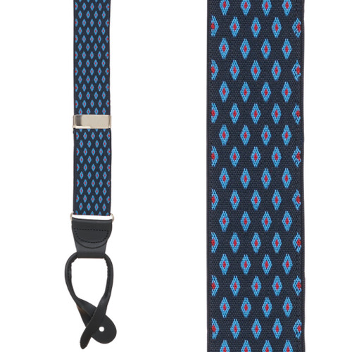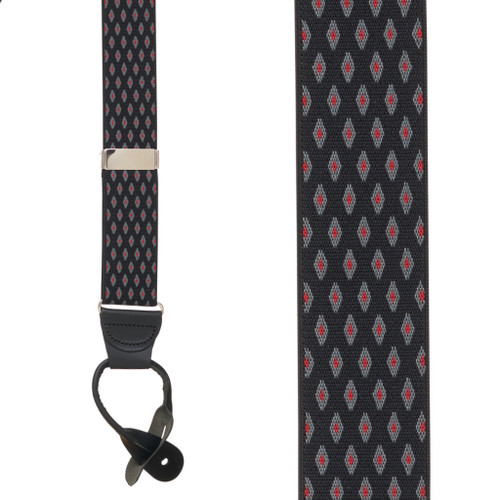 With their juxtaposition of shapes - diamonds, circles, hexagons, circles and more - and blend of hues, our geometric suspenders are as mesmerizing as looking through a kaleidoscope. The intricate patterns of our geometric suspenders result in a harmonious display that adds plenty of visual appeal to many outfits. We offer a variety of suspenders that range from subtle geometric prints to bolder ones. Our handsome selection of colors gives you the flexibility of filling your wardrobe with an assortment of light and dark hues for year-round wear. Geometrics are a popular choice among men and women due to their versatility. This print typically incorporates several complementary colors in one, giving you plenty of options when it comes to curating different outfits. A diamond and hexagon print in burgundy, navy, grey and white, for example, can be worn with a navy shirt one day and a white shirt another. The key is matching your shirt with one of the colors found within the print for a balancing effect. Do you typically wear solid-colored suspenders and are ready to take the plunge into the world of prints? Geometrics are the way to go! While the idea of wearing geometric may sound over the top (especially for those who dress more conservatively), our designs are done in a way that is subtle and refined, never garish. Typically made with brown leather button attachments and leather crosspatch, they are a popular option for business wear and formal occasions. Quality-made from premium materials, our geometric suspenders are available in button and clip-on attachments. Many of them conveniently come with convertible ends - button attachments and clips - giving you the flexibility to wear them either way; clips have a more casual look, while button attachments are for dressier occasions. They also come in a range of widths and styles, including Y-back and X-back.