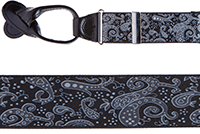 Celebrities are lining up for our paisley suspenders to show off this hot new fashion on today's red carpets. At the SuspenderStore, we're not surprised by all the attention. Paisley patterns have been at the top of must-have fashion wear lists since the East India Company first introduced the exotic style to Britain in the 1700s. You'll find the best selections in the contemporary classic look of paisley shirt suspenders at SuspenderStore.com. The subtle swirls that define paisley are beautifully captured in our silver paisley silk suspenders with elegant black runner ends. These button shirt suspenders in shades of silver and a muted gray are available in a 46-inch length that's adjustable to fit most men or women who stand 5-foot-2 to 6-foot-1 tall. The width is a dressy 1 3/8 inches on these 100 percent silk braces. They're best buy for grooms, best men and fathers of the bride at weddings. They're an elegant choice for formal galas. Pair them with our white pre-tied bow ties. We also carry this Y-back style in ivory and black. Browse our light blue on navy blue silk suspenders by Trafalgar. These luxurious button shirt suspenders have chocolate brown leather buttonhole attachments to fit to the waist buttons on dress pants. Button-on suspenders are the securest means to fasten to pants. All suspenders are considered a better way to maintain a graceful pants drape than belts. Go for the bold with our button silk suspenders with a large paisley pattern in regal purple. A discreet band of elastic is placed below the Y-back to create an ultra-comfortable fit on these 100 percent silk construction braces with brown leather button attachments. They look terrific with black or navy blue pinstripe suits. We also carry this style in red, light blue and dark blue. The width is 1 3/8 inches with polished brass hardware accents. Find the best size by visiting our Style Guide for Suspender Sizing page at SuspenderStore.com. Shop our satiny pre-tied bowties available in 21 colors to pair with your new suspenders. For this year's holiday and special occasion gift giving, consider our handsome suspenders instead of an ordinary necktie.
