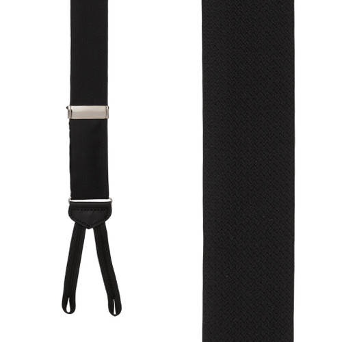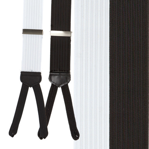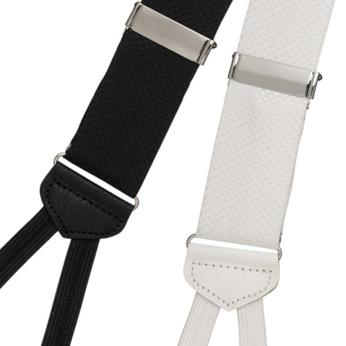 Tuxedo suspenders from the SuspenderStore are made for when only the fanciest suspenders will do! Proms, weddings, homecomings, bar mitzvahs, debutante balls, fundraisers and other dressy special occasions call for exceptional suspenders to add the perfect finishing touch to your attire. From our luxurious French satin suspenders, to sumptuous silk suspenders in solid colors and sophisticated patterns to formal runner-end suspenders, the SuspenderStore has just what you are looking for to add that extra touch of class. We carry multiple sizes and stock deep, so it's easy for you to find matching suspenders to perfectly fit everyone in your party. For a truly unique and distinctive flair, our hand-woven silk Limited Edition braces are both exquisite and exclusive. Suspenders are the perfect opportunity to show off your individual personality when dressing for a formal occasion. Tuxedo styles don't vary much and you may find yourself blending into the crowd too much. Shop our wide selection of formal suspenders to find the perfect accent to a plain black and white tuxedo ensemble. Find the right tuxedo suspenders for that next special occasion from the men's fashion accessory pros at the SuspenderStore. We carry an option for every style and personality. Choose muted or bold solid colors or elegant patterns in silk or French satin finishes. We also carry ribbed suspenders, paisley silk tuxedo suspenders and black jacquard checkered suspenders for dress shirts. Dress to impress with our collection of Trafalgar Limited Edition braces. These tuxedo shirt suspenders by Trafalgar are hand woven on a wooden loom. The patterns of these silk braces are available on a limited basis, so yours will be a keepsake. Each set arrives in a box with a collector's card. For holidays, weddings, birthdays and anniversaries, we can't think of a more impressive gift than Trafalgar silk shirt suspenders. For that next special event, consider our formal ribbed dress suspenders crafted of premium ribbed elastic with runner-end fabric button attachments. These ribbed construction tuxedo suspenders have Y-back styling in a 1 3/8-inch width. Choose black or white. Shop our diagonal striped silk suspenders to complement tuxedoes or business suits. Consider a subtle paisley pattern on black, ivory or silver silk that are available with runner ends. Our black elastic paisley suspenders are available with clip or button attachments. These patterned suspenders make a great alternative to the traditional black tux suspenders. Order our French satin suspenders for the groom, best man and groomsmen to make it a memorable wedding. These satin finish tuxedo suspenders are 1.5 inches wide with a rich leather cross piece in the back, polished brass-tone hardware and dressy drop clips in three lengths. Choose them in a rich red, white, black, navy blue or camel. Choose one of our solid color Trafalgar brand herringbone silk braces for the most elegant occasions. These silk tuxedo suspenders are 1 3/8 inches wide. We also carry limited edition Trafalgar braces that are completely unique and effortlessly show off your personality. They feature themes such as chess, golf, car racing, hourglasses, Polynesia, coral reefs and more. Below the Y-back is the discreet addition of elastic to ensure a comfortable fit. Browse our collection of jacquard suspenders with petite diamond or checker patterns. Order them with metal clips or traditional button attachments. If you're not sure about the length, visit our Style Guide for Suspender Sizing page. We have also created style guides for suspender widths, attachments and suspender backs that have won praise from long-time and first-time customers. Finish off your formal ensemble with the additional tuxedo accessories available from the SuspenderStore. These include bowties, pocket squares and crepe lapel flowers. Our bowties come in adult and child sizes, and are pre-tied for easy use. They come in a wide range of different solid colors that will pair perfectly with your set of tuxedo suspenders. We carry pocket squares in a selection of classic colors as well as bright colors for a more exciting look. You can make your formalwear shopping even easier with our bowtie and cummerbund set, as well.
