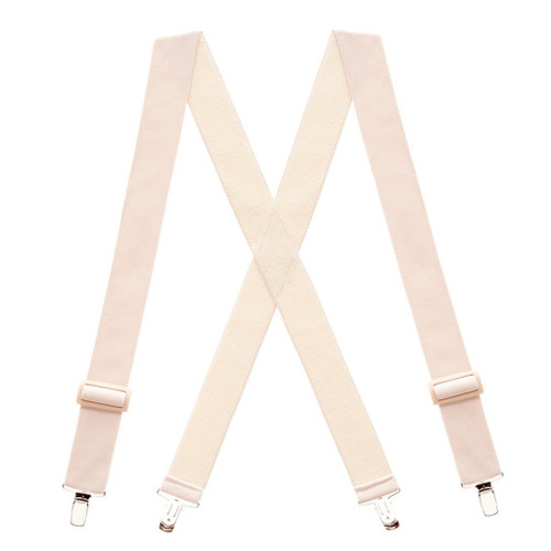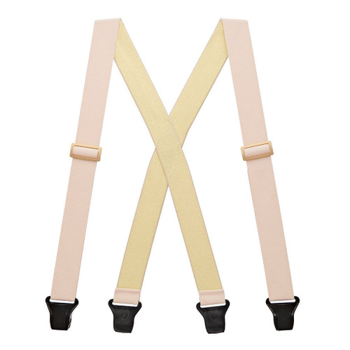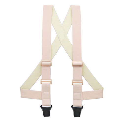 Want the functionality of a suspender without the look? Our super-soft undergarment suspenders are made to wear UNDER your shirts for the ultimate in suspender discreetness! Similar in look and feel to an ace bandage, these almost invisible suspenders offer the same great support as our other elastic suspenders but are extra soft to make wearing them against your skin both comfortable and unnoticeable - just like underwear suspenders should be! They're available with two different clips - regular nickel finger clip and in our buzz-not plastic clip for an airport friendly solution. Buzz-not clips won't set off the metal detectors in airport security lines. If you travel a lot on business or for pleasure, this is a smart way to avoid having to remove your belt or suspenders before each flight. Our buzz-clip suspenders are welcome bon voyage gifts for frequent flyers. Made of flesh-tone colored material with matching beige adjusters, these suspenders can be worn either right next to your skin or over an undershirt. They're great for anyone who likes to wear their shirts untucked and also work wonderfully under surgical scrubs, uniform shirts or as a belt alternative for people with special medical needs. All out-of-sight suspenders - literally and figuratively - from SuspenderStore.com are available in your choice of a 42-inch, 48-inch or 54-inch length. The fabric is a soothing elasticized material. Choose a 1.5-inch width or a 2-inch width for your suspenders. Click on our sizing chart to find your best length. We carry four types of undergarment suspenders: X-back metal clips, X-back airplane friendly plastic clips, side-attachment construction with metal clips and side-attachment with plastic clips. Traditional suspenders have four clips to attach to your pants at the back and front. Side-clip suspenders have two clips that attach to the sides of your pants and are more comfortable than the back clips on traditional suspenders when you're sitting for long periods of time.